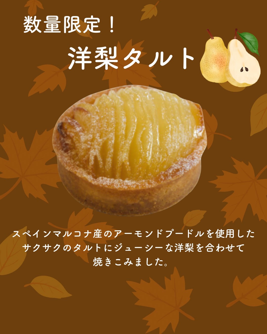 スペインマルコナ産の最高級アーモンドを使用した香り高いタルト生地にジューシーな洋梨を合わせて焼き上げています。